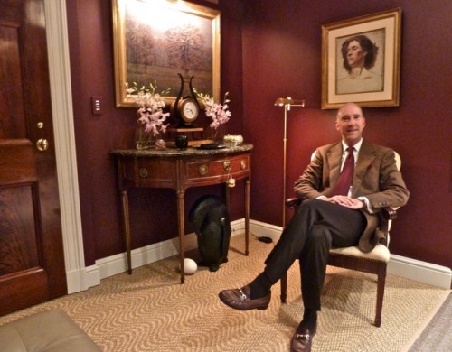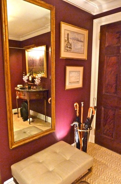The space was impeccably appointed with all the perfect pieces for a gracious city entry. From the 19th century English brass and steel umbrella stand, to the handsome Baker Thomas Pheasant leather bench, the room was both practical and elegant.