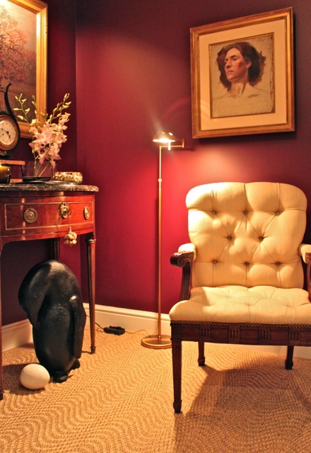 And yet Petersen’s space was not without humor. I loved the Bronze Penguin “Parenthood” with egg sculpture by Michael McLaughlin. Subtle yet effective, its placement seemed, like everything else in the vignette – effortless. The sisal is the beautiful new wave pattern by Stark.