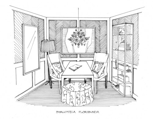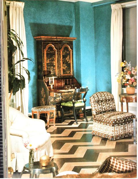 “When I think of an Albert Hadley room, I think of a space with a sense of clear geometry and definite color. Graphic patterns, precise arrangements and emphatic bursts of color clearing away the cobwebs of fussy decorating.  There is a clarity of thought and an optimism in his design work that demonstrates a Modernist point of view. An outlook that avoids a historicism and sterility.  My vignette hopes to capture some of that dynamism with graphic accents, clear color, mid-century furnishings and contemporary art.  I also really wanted to reconsider floral fabrics, the best of which are artworks in-and-of themselves.   Albert never shied away from a good print, and I feel like recent decorating has avoided florals, thinking of them as Granny’s smelly old sofa.  Done correctly they can be as up-to-date and impactful as more rigidly geometric patterns.”