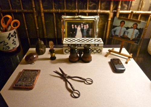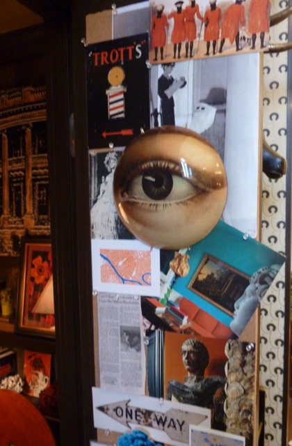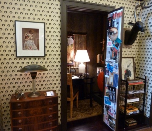 Inside is a gentleman’s reading/writing room with an eclectic yet appealing mix of objects – more clues.