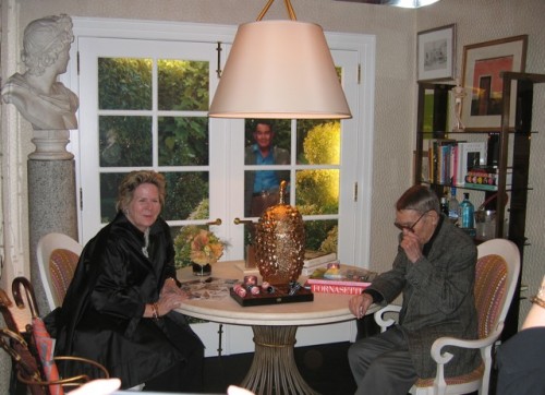 Here are Bunny and a dapper Albert in Bunny’s booth. I love the blown-up photo of a younger Hadley behind the French doors. The ecclectic room was furnished with many wonderful Beeline pieces from the Eclipse chairs to the fabulous Harvest table and fun Spiral Umbrella Stand, a perfect accessory on this wet evening.