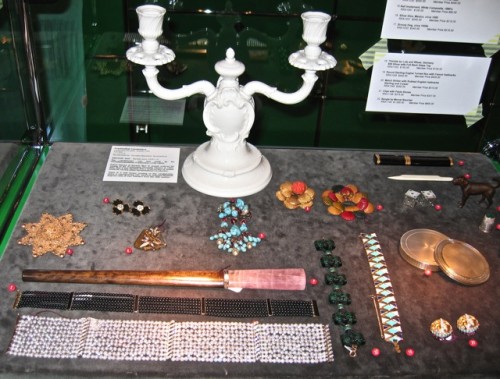 You know I had to try everything on. This Edwardian pearl choker in front almost seduced me – it is simply divine – delicate yet a major statement and a perfect fit – evidently unusual as the very accommodating sales manager explained. In the back is an absolutely beautiful Frankenthal candelabra, made at Nymphenburg from the same original mold as the 1762 original – the luster was just lovely. There were also some intriguing pieces by contemporary designers, including beaded pieces designed by the Rodarte girls and made by their mother. After several irresistible book purchases from their impressive collection, it was time to move on to the actual exhibit.