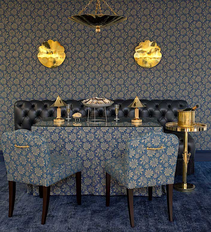 Below, in gold on indigo linen, the same pattern is completely transformed within a stylish club like environment featuring a pair of the oh-so-chic Carafe Tables, shown here in polished brass but available in any of Soane’s metal finishes.