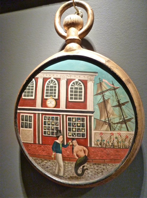 A more whimsical offering, from Earle D. Vandekar of Knightsbridge, was this Ralph Cahoon work, “Shreve’s Watch Shop, Boston.” Like many of Cahoon’s naive style paintings, this unique oil on an antique pocket watch shop sign features a mermaid in a seaside setting. This came originally from the collection of Wayne Pratt, a former dealer on Nantucket, whose eponymous shop carried the works of many local and Cape Cod artists.