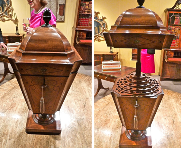 Michael Pashby Antiques carries a selection of fine English antiques from the mid 17th century to late 19th century. I have seen many knife boxes but this gorgeous mahogany and ebony inlaid cutlery run was exceptional. Influenced by Thomas Hope, this Grecian Style piece from c. 1810, at over two feet tall, opens to hold twelve settings.