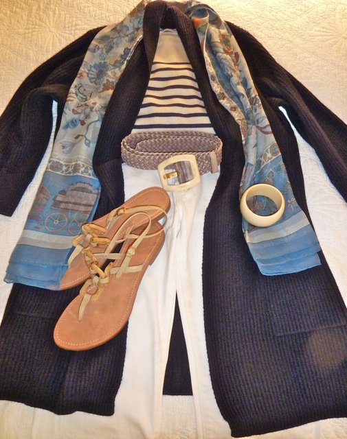 As far as determining what clothing to bring, I have learned all I know from my sister, who used to travel around the world for work. She is an expert at packing efficiently for ultimate chicness at every occasion. The key is to plan your wardrobe around one or two basic hues. You must be brutal with yourself when choosing – no exceptions!  My summer wardrobe usually revolves around navy and white with pops of color thrown in with jewelry, scarves, tanks etc. Here is a perfect example of what I might bring to the beach where it gets cool at night. All of the pieces can easily mix and match with other items. Go from day from evening with changes in shoes, jewelry, bag and make up!! This casual outfit could easily be transformed for a dressier night out by switching out the sailor top with a sexy tank, chunky jewelry and heels! The light scarf could double as a shawl for a not-too-cold evening.