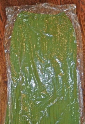As for the actual packing, be sure to save those clear plastic dry cleaner bags. They are essential for keeping clothes wrinkle free. Just place your garment flat inside and then gently fold to fit your suitcase. I recently packed this micro pleated skirt for blogfest. Here it is being packed.