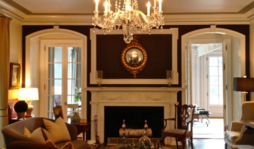 The living room is a classically elegant space and yet Susan Bednar Long has infused it with youthful touches reflecting the current residents. The fabulous brown accent wall, in Christopher Peacock Paint‘s Bitumen anchors the large room. Throughout the residence, an effort was made to use existing pieces and the secretary, now housing family pictures, is one of the most significant pieces in the home.