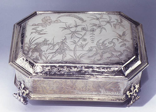 Made in 1683-84, the pieces have just such Chinese scenes chased on the silver, although the silversmith, William Fowle, probably just made the boxes and sent them to a specialist for the decorations. It’s amazing that these fanciful engravings look so contemporary in their decorative style. And don’t you love the incredible feet? I adore silver and would just love to have such a set displayed on a dresser in my bedroom as a daily visual feast.