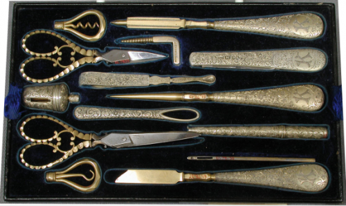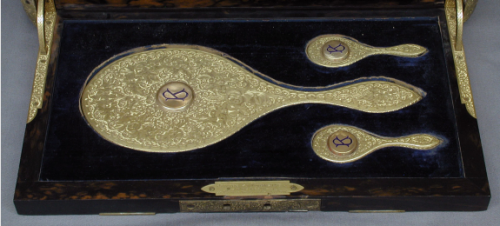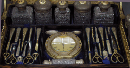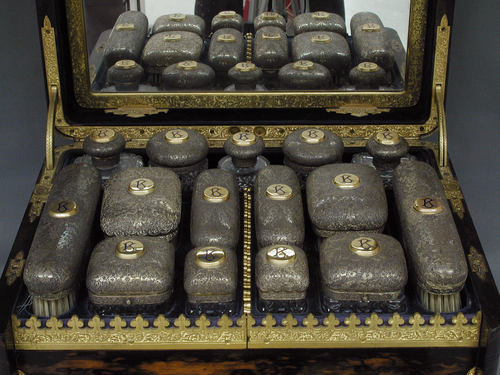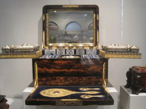 This speaks volumes about upper crust life in England at this time when elaborate dressing preparations were the norm. This custom of housing beauty necessities together started as early as ancient Egypt, leading to the design of chests specifically for that purpose. And although shapes and materials may have changed over the centuries, the concept stayed the same. Think of those elaborate Louis Vuitton or Goyard cases – the idea started here.