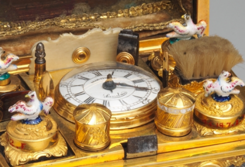 Fitted with a drawer below, it contains a variety of toilet, sewing and writing tools as well as a splendid watch.