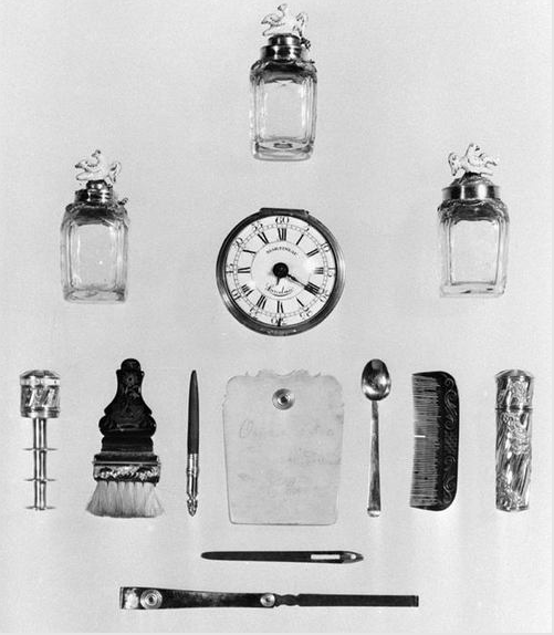 This luxurious silver toilet service is something a young 17th century upper class bride might have received as a wedding present from her parents or husband. The owner would have kept this in her bedroom or closet (really more of a sitting room). During this period, Chinese ornamentation was in vogue and the decorations of her closet would have reflected that with blue and white porcelain and other touches of the orient.