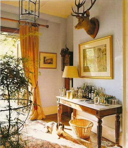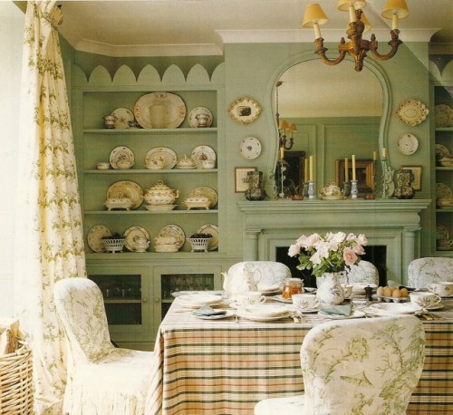 Isn’t this breakfast room the epitome of country chic? I love the Pillement Toile with the Bowood – a combination I wouldn’t have thought would work but with the addition of the Ian Mankin check, it somehow does, with the sublime green, a mixture of three Farrow and Ball colors, anchoring it all.